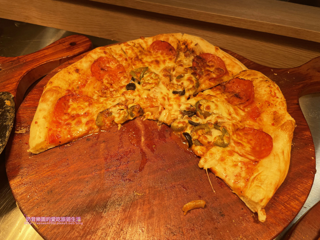 連我喜歡的墨西哥臘腸也有,披薩料都很均勻看起來很用心在做,剛出爐的時候最好吃。